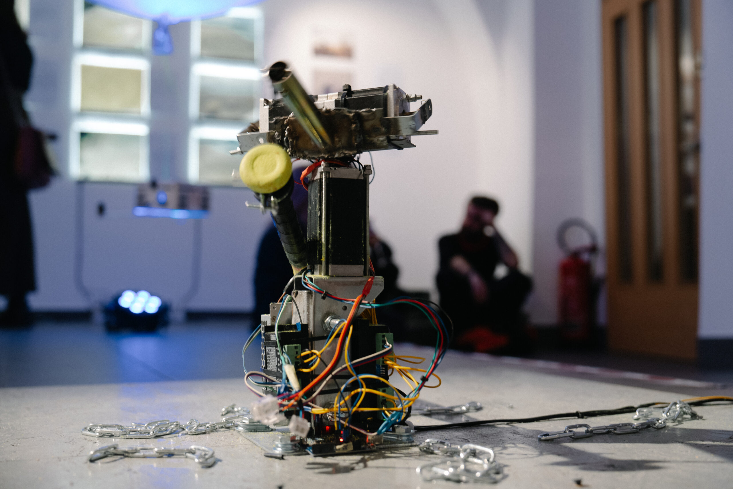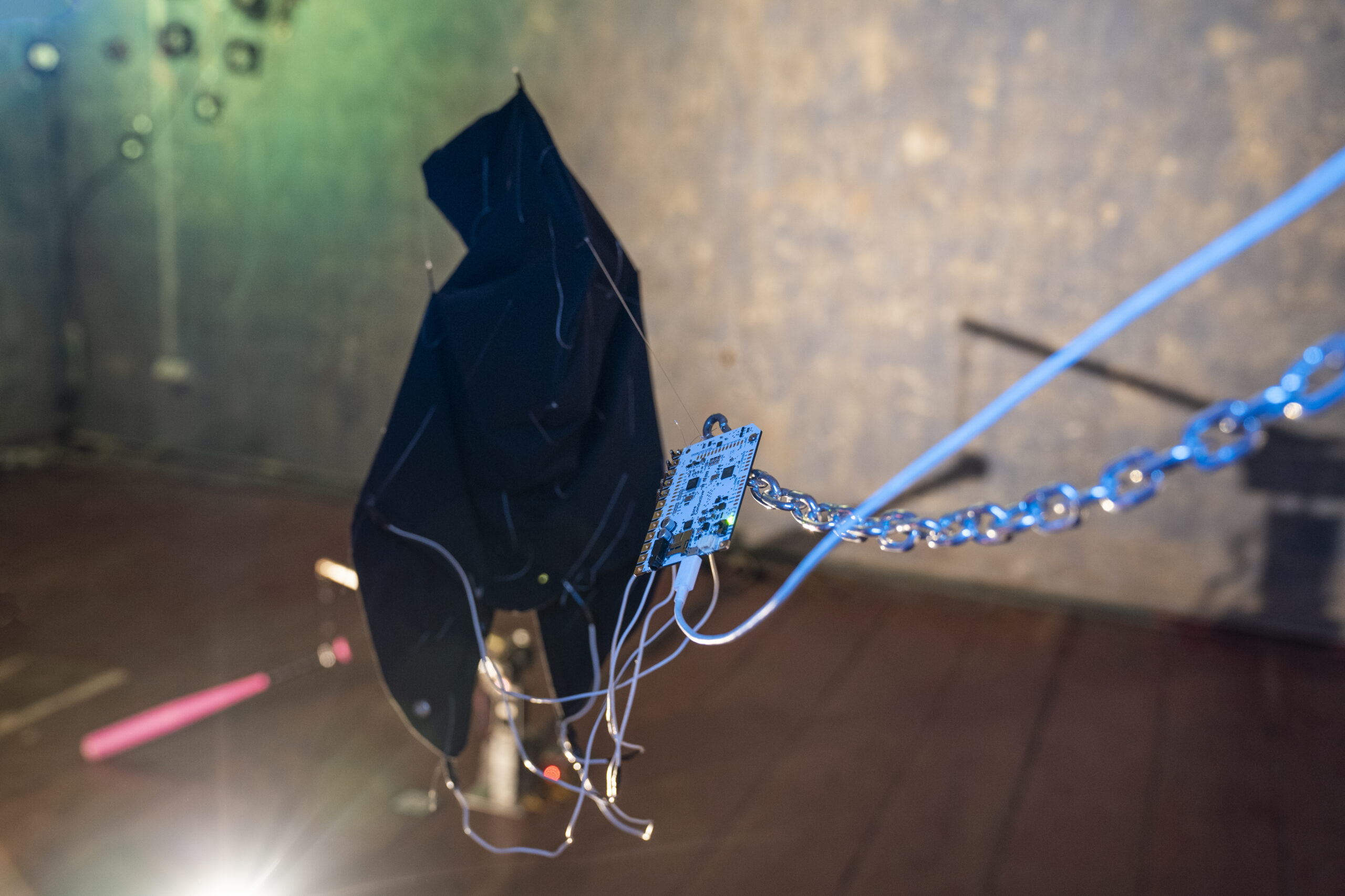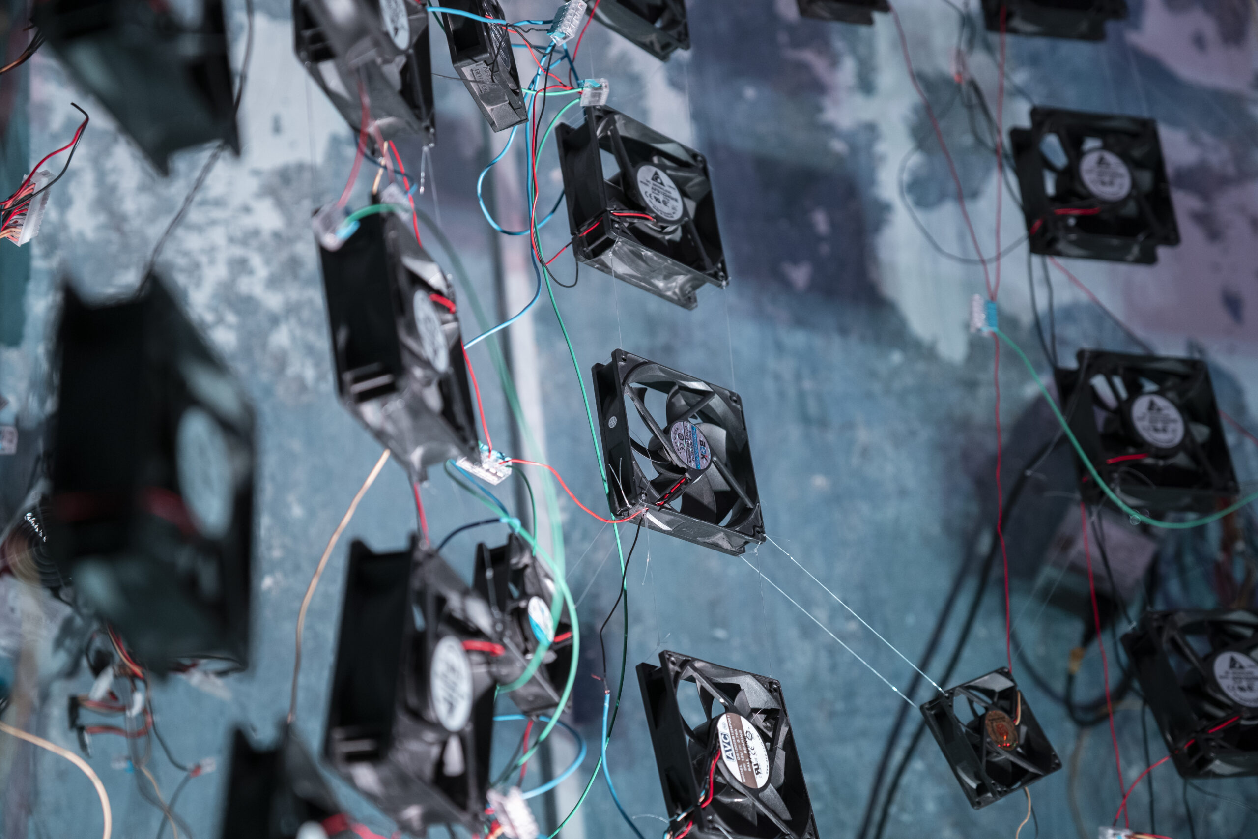 installation / AR, AI, electronic circuit, stepper motor, servomechanism, 3d printing, fabric, pc fan, hexbug, baseball, chain