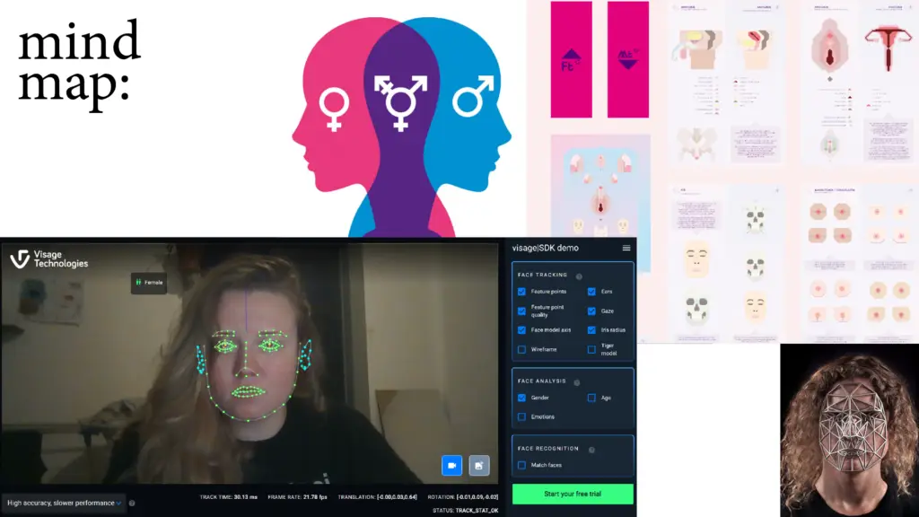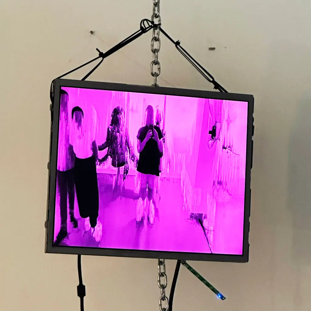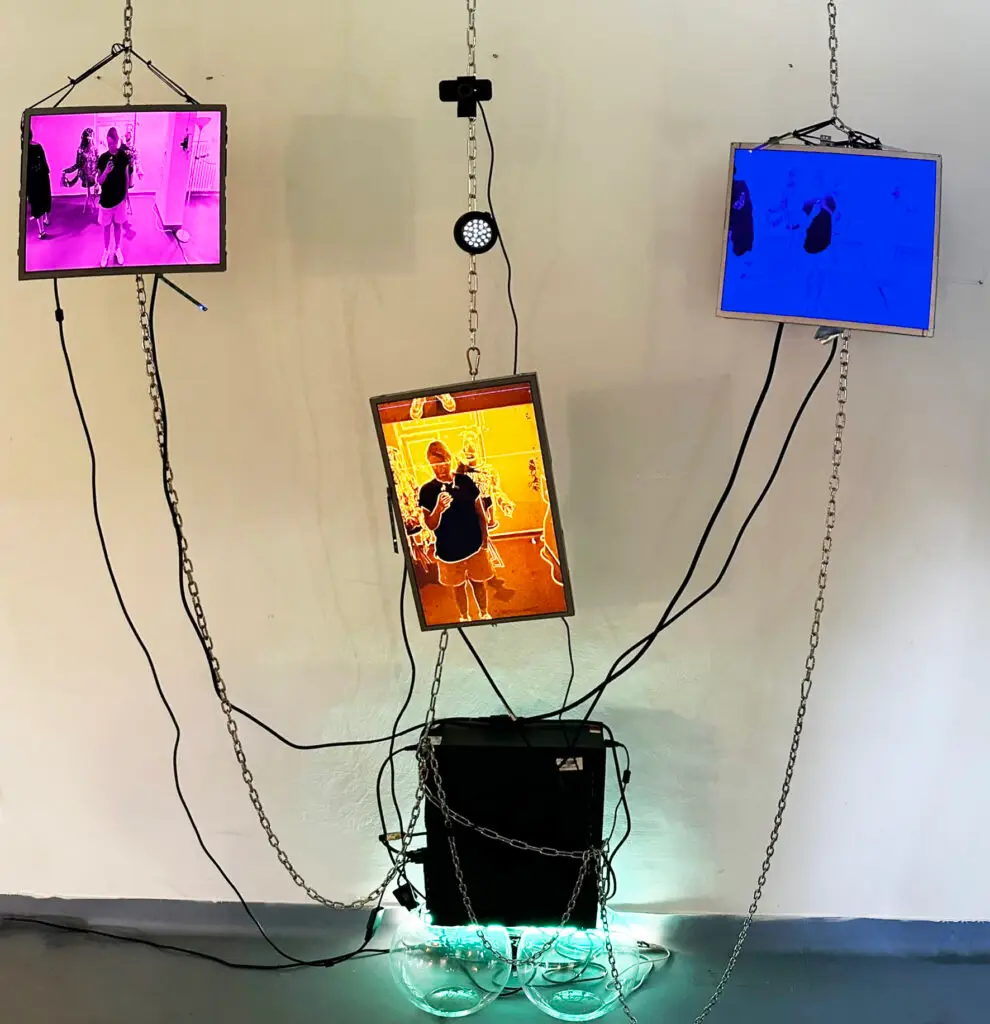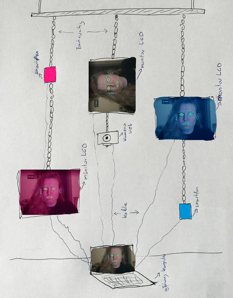 Instalacja badająca płynność tożsamości płciowej i arbitralność binarnych podziałów społecznych. Praca składa się z trzech pionowych kolumn zbudowanych z ekranów LCD. Kamera internetowa przechwytuje postać osoby stojącej przed nią, a użyty software przetwarza ją w czasie rzeczywistym, generując trzy równoległe wersje portretu. Lewa kolumna przedstawia wersję sfeminizowaną o różowym zabarwieniu, prawa — wersję zmaskulinizowaną o niebieskim zabarwieniu, a centralna — wersję niebinarną, łączącą cechy kobiece i męskie w niestabilnym obrazie. Instalacja zachęca do refleksji nad własną tożsamością, a także nad sztywnością społecznych kategorii płci. Instalacja staje się nie tylko lustrem, ale także narzędziem dezintegrującym binarne schematy, proponując przestrzeń na queerową interpretację ciała i jego reprezentacji.