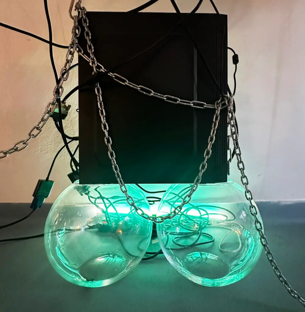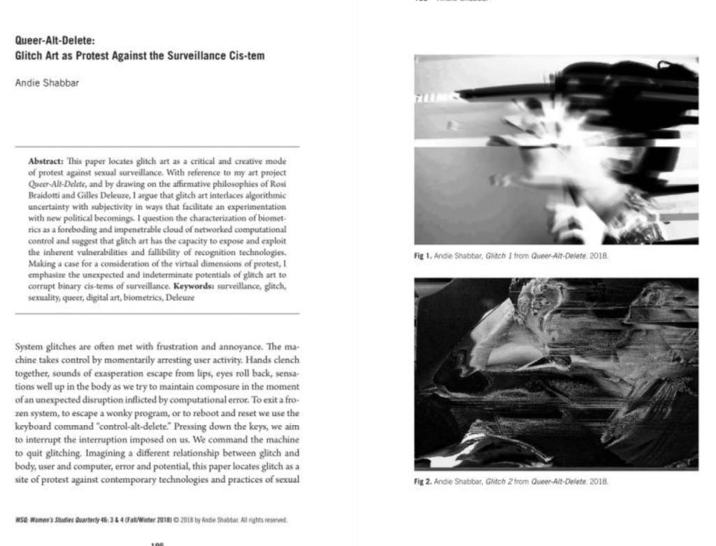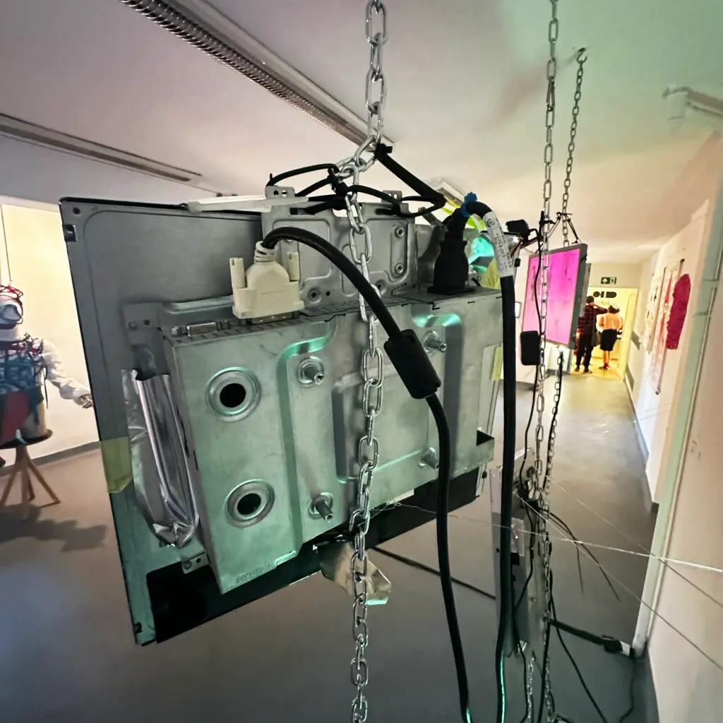 Instalacja badająca płynność tożsamości płciowej i arbitralność binarnych podziałów społecznych. Praca składa się z trzech pionowych kolumn zbudowanych z ekranów LCD. Kamera internetowa przechwytuje postać osoby stojącej przed nią, a użyty software przetwarza ją w czasie rzeczywistym, generując trzy równoległe wersje portretu. Lewa kolumna przedstawia wersję sfeminizowaną o różowym zabarwieniu, prawa — wersję zmaskulinizowaną o niebieskim zabarwieniu, a centralna — wersję niebinarną, łączącą cechy kobiece i męskie w niestabilnym obrazie. Instalacja zachęca do refleksji nad własną tożsamością, a także nad sztywnością społecznych kategorii płci. Instalacja staje się nie tylko lustrem, ale także narzędziem dezintegrującym binarne schematy, proponując przestrzeń na queerową interpretację ciała i jego reprezentacji.