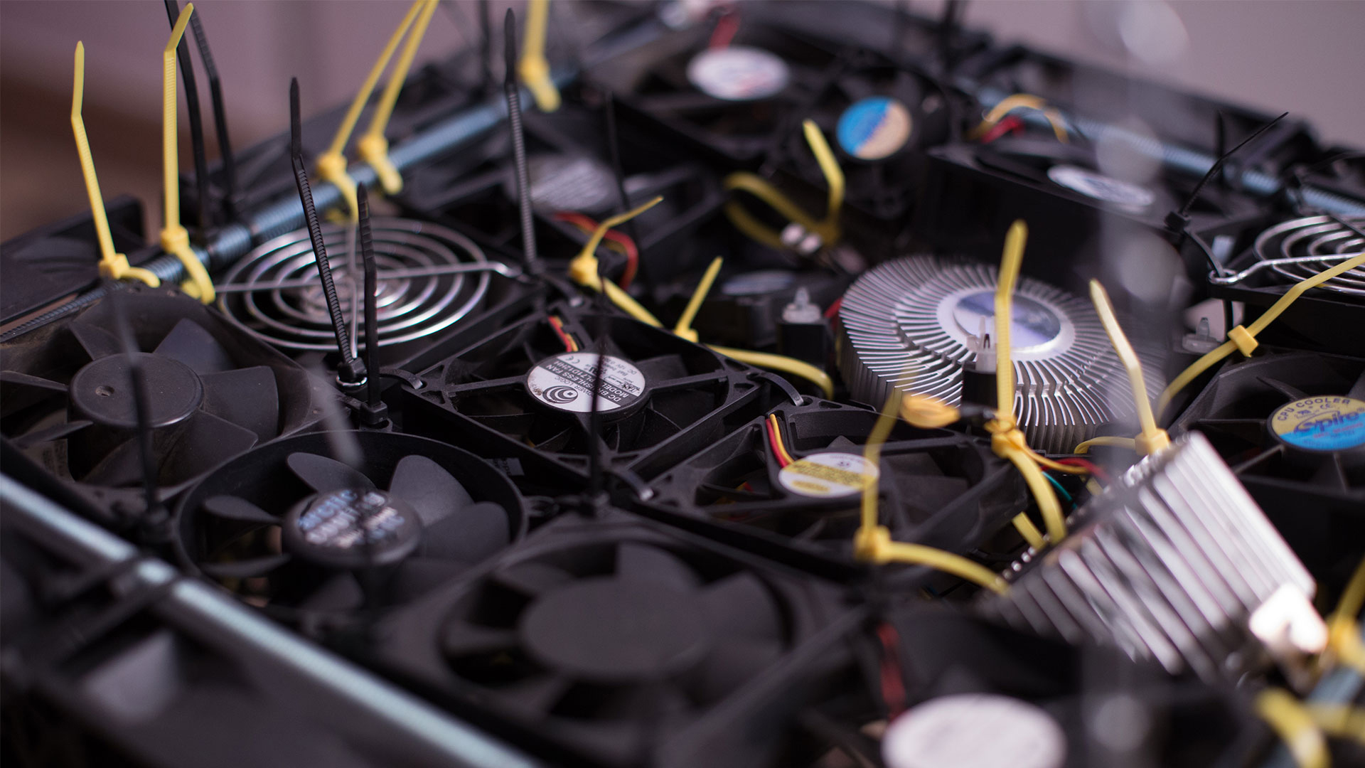 reclaimed computer fans (e-waste), computer power supply units, metal frame.