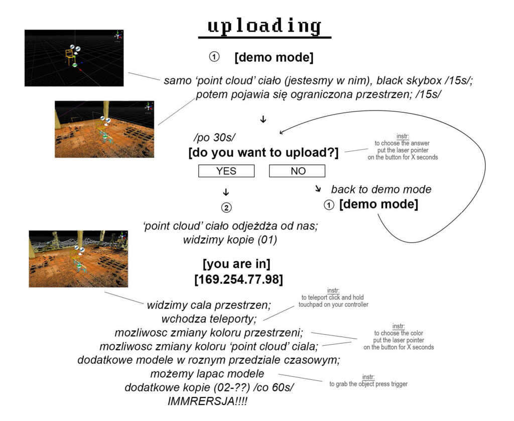 Tytuł nawiązuje do terminu mind uploading*. Realizacja określa moment transferowania do wirtualnej przestrzeni, połączenia się z nią, wyjścia użytkownika z biologicznego ciała i tworzenia jego kopii. Łączy ponadto przestrzeń przypominającej tę fizyczną (fotogrametrię) z wirtualną, a następnie coraz bardziej digitalizuje ją. Autorka stworzyła scenariusz, który polega na umieszczeniu nowych elementów oraz interakcji. Rozszerza się teren, po którym odbiorca może chodzić lub teleportować się. Nowe składowe nie przypominają już tych, które można spotkać w rzeczywistości fizycznej.